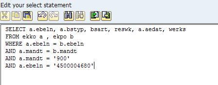 Attention cependant la syntaxe n’est pas celle appliquée en ABAP. Le symbole « ~ » n’est pas utilisable (à remplacer par « . ») et il faut préciser le mandant car SAP n’intervient pas sur la requête comme en ABAP. La syntaxe avec la clause INNER JOIN (et certainement d’autres) ne semble pas supportée. Il faut donc lier les tables dans la clause WHERE.